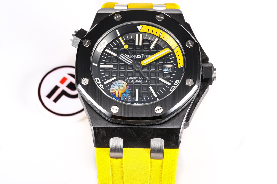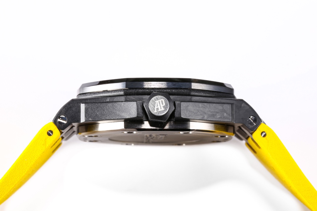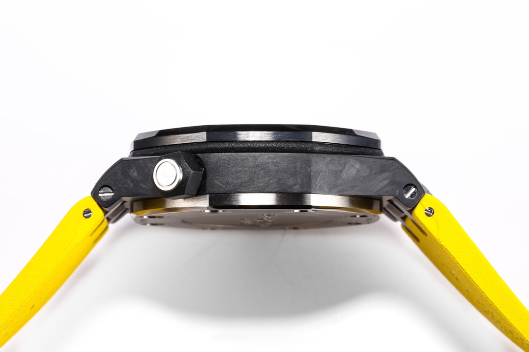 Forged carbon case, glareproofed sapphire crystal, titanium caseback, black ceramic bezel and screw-locked crown, titanium links.